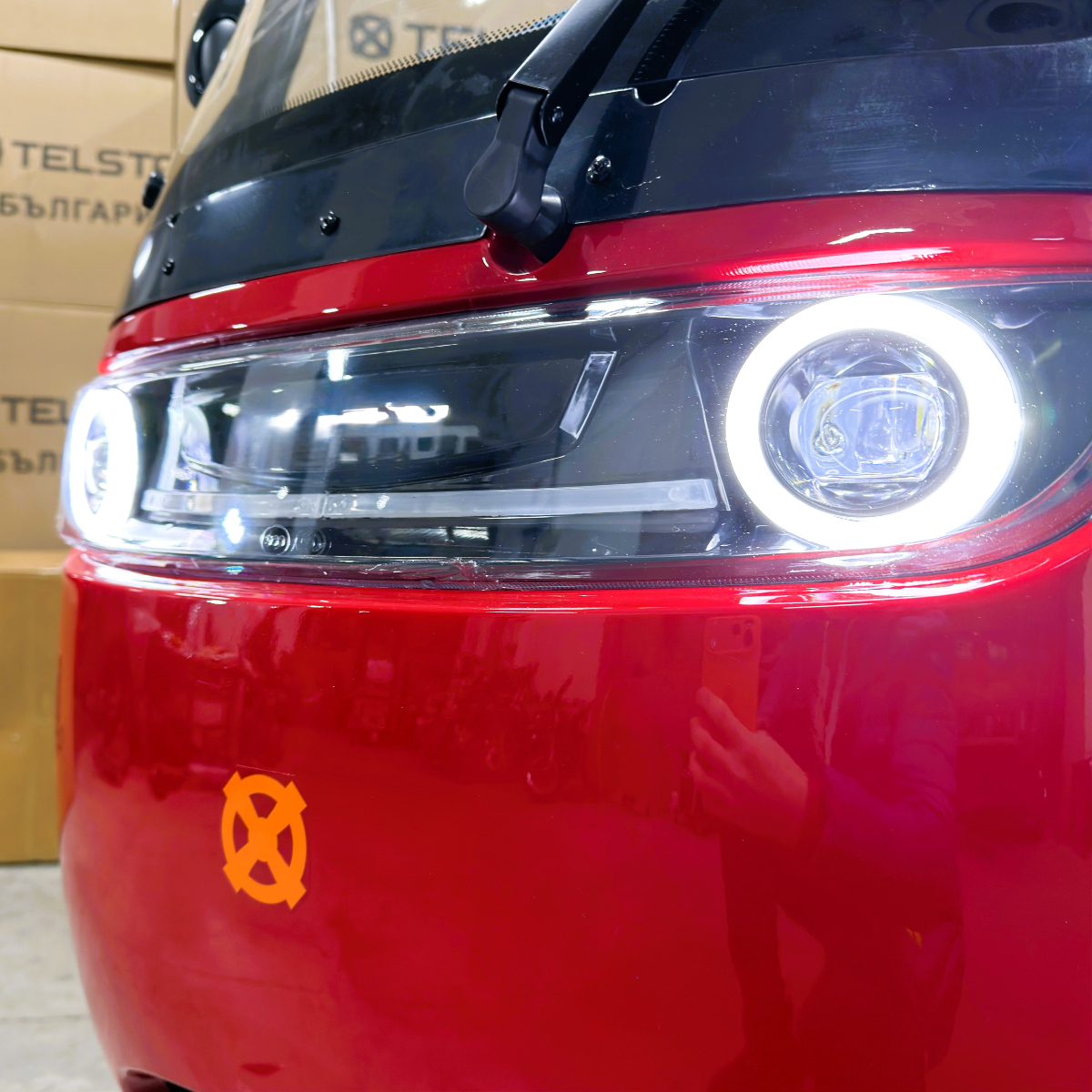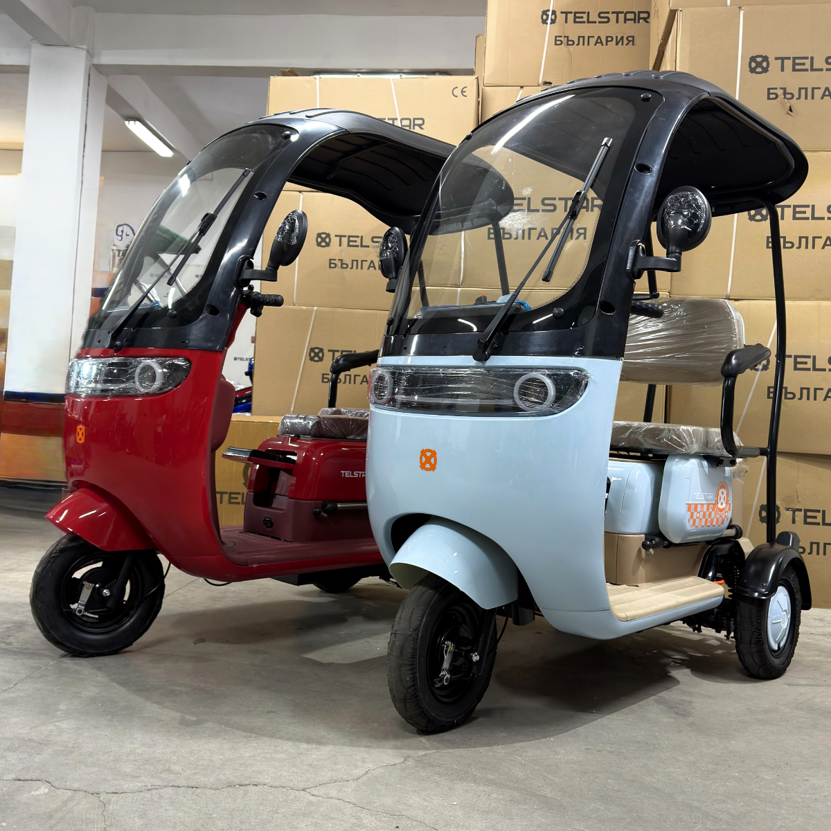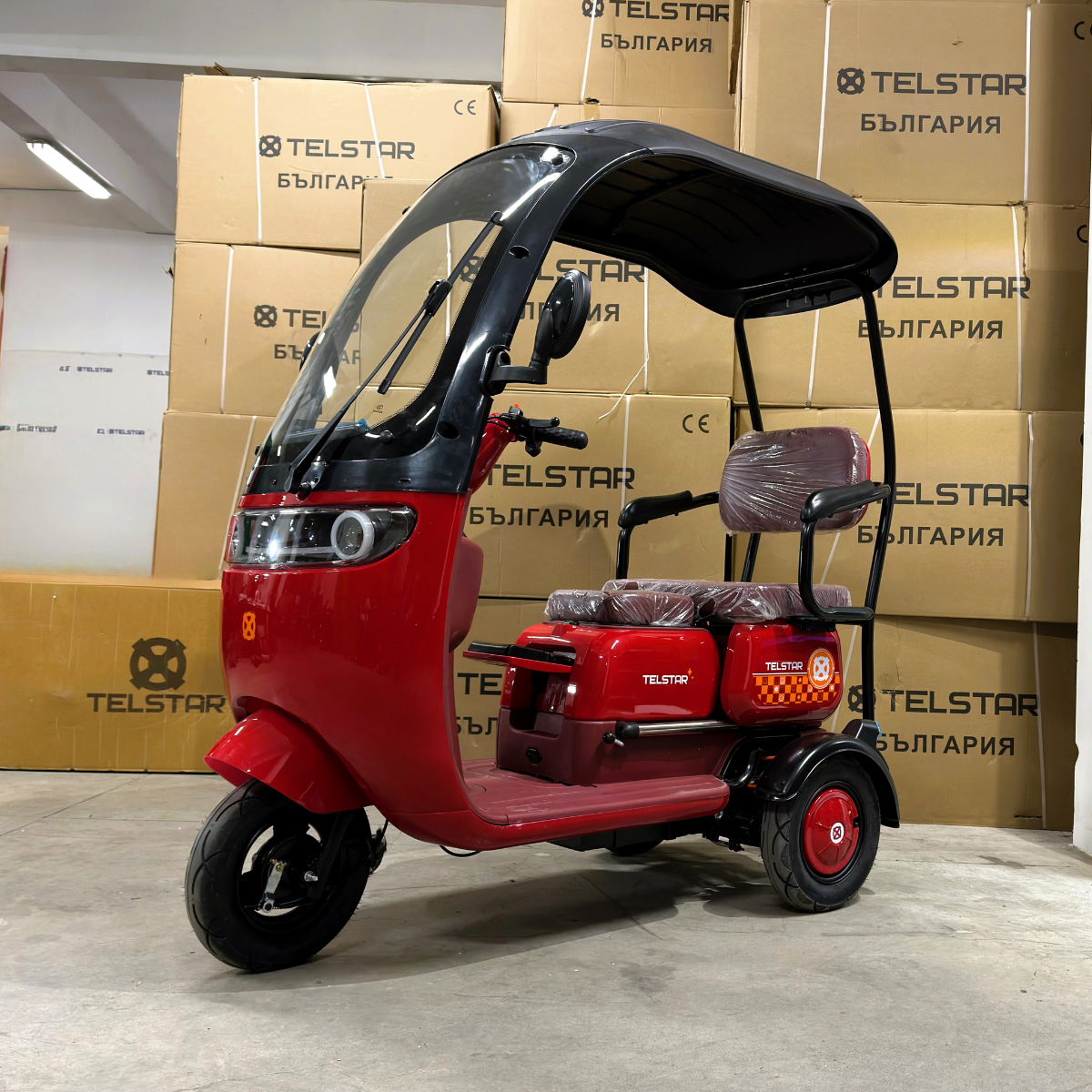 Триместна електрическа триколка TS 350-7 ROOF UNIVERSAL 2000W 25Ah с покрив, предно стъкло и чистачка с електромотор за защита от слънце, дъжд и вятър.
